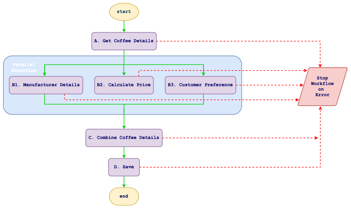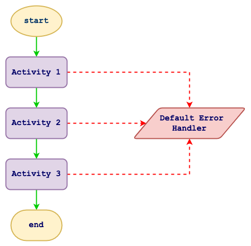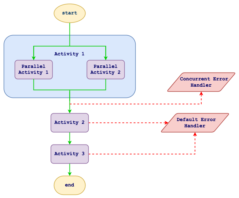 As shown in the diagram above, two activities run in parallel and once both of them have completed their execution, the flow then passes to the other two activities. Notice that the error handlers are different for concurrent and sequential executions.